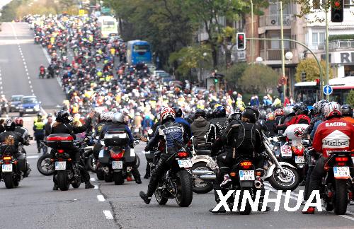 11月8日,眾多摩托車手在西班牙首都馬德里市中心街道參加大游行。當(dāng)日,來(lái)自西班牙各地的上萬(wàn)名摩托車手在首都馬德里參加大游行,呼吁政府部門改善道路交通條件,保障摩托車出行安全。據(jù)統(tǒng)計(jì),西班牙2007年共有500余名摩托車手在交通事故中喪生。新華社記者陳海通攝