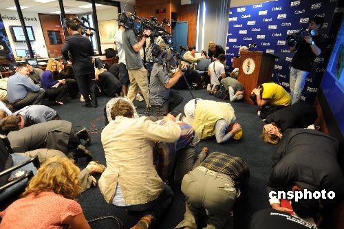 11月13日上午,美國洛杉磯地區(qū)模擬發(fā)生7點8級大地震,一陣模擬地震的音效響過,正在加州理工學(xué)院參加記者會的地震專家和媒體記者立即抱頭跪地,演練大地震來襲時的自救方式。當(dāng)天,南加州舉行號稱美國歷史上最大規(guī)模的地震演習(xí),估計有五百萬人參與。美國地震專家預(yù)測,近三十年內(nèi),南加州極有可能發(fā)生大地震,一旦發(fā)生七點八級大地震,將造成一千八百人死亡,五萬多人受傷,經(jīng)濟損失高達兩千億美元。中新社發(fā) 張煒 攝