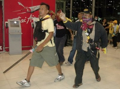 泰國反政府的人民民主聯(lián)盟(民盟)25日繼續(xù)在曼谷舉行大規(guī)模示威活動,示威者堵塞通往曼谷國際機場的高速公路并沖入機場大樓。最新消息指稱,機場已于晚間被迫關(guān)閉,航班全部取消。