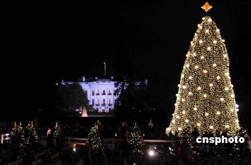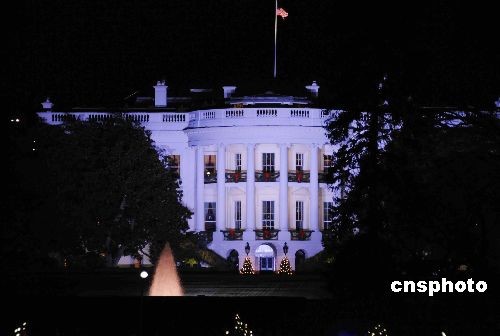 當(dāng)?shù)貢r間12月4日晚,美國華盛頓白宮南草坪萬人聚集,美國總統(tǒng)布什和夫人勞拉出席2008年“國家圣誕樹”點亮儀式。白宮南草坪的“國家圣誕樹”點亮儀式最早開始于1923年,白宮的主人都會在每年十二月第一周點亮這棵大型的圣誕樹和周圍栽種著象征美國五十個州小樹上的燈珠。圖為當(dāng)夜白宮在圣誕樹的映照下。中新社發(fā) 邱江波 攝