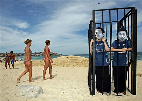 12月9日在悉尼邦迪海灘上,“綠色和平”組織成員站在一個(gè)籠子中,裝扮成日本兩位捕鯨抗議者Junichi Sato和Toru Suzuki,映射這兩位抗議者揭露日本非法捕鯨卻將被送進(jìn)監(jiān)獄的情況。在他們身后有一個(gè)17米長的沙雕長須鯨。