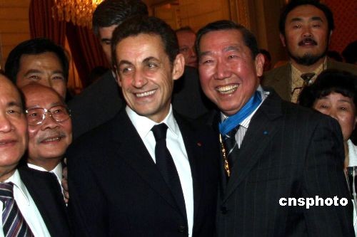 當(dāng)?shù)貢r(shí)間12月18日晚,法國總統(tǒng)薩科齊在總統(tǒng)府愛麗舍宮為旅法華人何;壬(右)頒授司令級(jí) “法國榮譽(yù)軍團(tuán)勛章”。薩科齊稱贊何;灶B強(qiáng)的奮斗精神,在法國取得了很大的成功,多年來不忘參與法國當(dāng)?shù)氐恼紊詈凸婊顒?dòng)。中新社發(fā) 蘇宜 攝