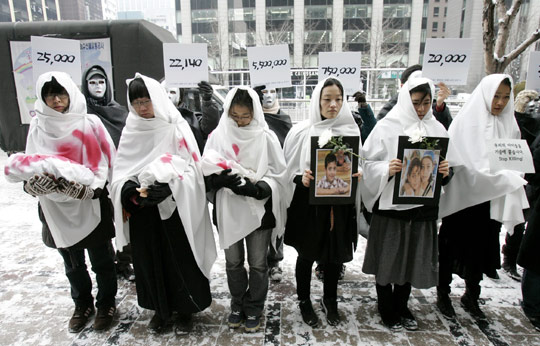 1月16日,韓國(guó)一些民眾聚集在首爾以色列使館前進(jìn)行示威,幾位婦女手舉象征在戰(zhàn)火中喪生的兒童照片和玩偶,抗議以色列襲擊加沙。