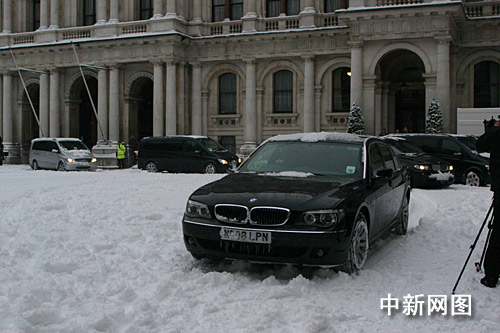 當(dāng)?shù)貢r(shí)間二月二日上午八時(shí)三十分許,中國總理溫家寶在英國倫敦出席布朗首相舉行的歡迎儀式。圖為溫家寶的座車駛?cè)胗饨徊績(jī)?nèi)庭院歡迎儀式現(xiàn)場(chǎng)。前夜,倫敦突然迎來近十七年最大的一場(chǎng)降雪,整座城市被白雪覆蓋。中新社記者 張朔 攝