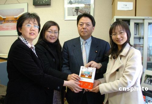 2月6日,日本前防衛(wèi)大臣、日中友好議員聯(lián)盟秘書長、參議院議員林芳正,在他的事務(wù)所接見了第四屆中國人日語征文大賽主辦單位代表日本僑報(bào)社社長張景子和兩名最優(yōu)秀獎(日本大使獎)獲獎?wù)摺本┐髮W(xué)研究生徐蓓和湘潭大學(xué)青年教師張桐赫。林芳正勉勵獲獎?wù)吆退袇①愓呃^續(xù)努力,為日中交流作出更大貢獻(xiàn)。圖為林芳正與徐蓓、張桐赫及主辦單位代表合影。中新社發(fā) 段躍中 攝