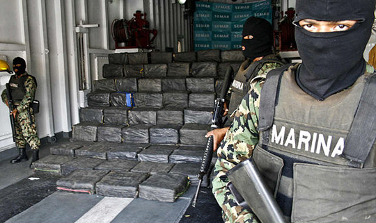 2月16日,在墨西哥的一處海軍基地,士兵正在看守繳獲的可卡因。15日,墨西哥海軍在太平洋國(guó)際海域的一艘船上繳獲近7噸可卡因,并扣押船上5名嫌疑人。