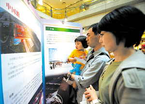 相比往年,本次“上海與上海世博會”圖片展首次利用了羽田機場這一重要交通窗口作為展示平臺。羽田機場1號出發(fā)大樓2樓大廳內(nèi),100多幅精心挑選的照片巨大而醒目,多媒體的宣傳片循環(huán)播放,讓機場成了一個“上海世博推介臺”。展區(qū)門口,“海寶”揮手迎客,可愛的模樣煞是惹人喜歡,孩子們紛紛上前拉拉“海寶”的手、親親“海寶”的臉。圖片展示成了機場內(nèi)的一個焦點,眾多來往旅客紛紛駐足觀看,舉辦方則在不停地派發(fā)世博宣傳資料、贈送世博小禮品,氣氛十分活躍。