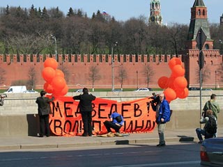 據俄羅斯新聞網報道,俄羅斯反對黨“團結運動”組織成員4月28日在克里姆林宮前舉行了聲勢浩大的反政府游行活動。期間,3名“團結運動”的積極分子在克里姆林宮附近的河岸邊懸掛紅色的巨型橫幅,上面印有:“梅德維杰夫,辭去普京總理職務!弊謽,橫幅兩邊系有紅色的氣球,橫幅下部印有“團結運動”組織的徽標。