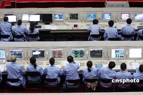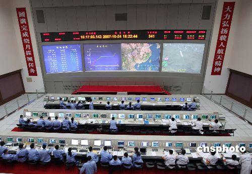 十月二十四日下午,北京航天飛行控制中心工作人員在做嫦娥一號衛(wèi)星發(fā)射前的最后準(zhǔn)備。中國首顆月球探測衛(wèi)星——嫦娥一號發(fā)射工作已經(jīng)準(zhǔn)備就緒,計劃于當(dāng)日十八點零五分發(fā)射。中新社發(fā) 毛建軍 攝