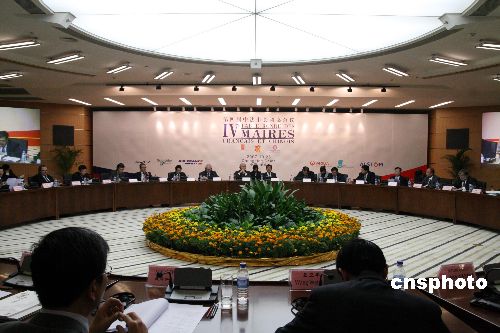 10月26日,第四屆“中法市長(zhǎng)圓桌會(huì)議”在山城重慶拉開帷幕!爸蟹ㄊ虚L(zhǎng)圓桌會(huì)”由中法兩國(guó)元首倡議于2004年創(chuàng)設(shè),由中國(guó)人民外交學(xué)會(huì)和法國(guó)法中委員會(huì)共同組織,每年輪流在兩國(guó)舉辦。會(huì)議主要圍繞城市規(guī)劃和建設(shè)、可持續(xù)發(fā)展等主題進(jìn)行研討,并就中法城市間的交流、合作、建設(shè)進(jìn)行商洽。中新社發(fā) 郭晉嘉 攝