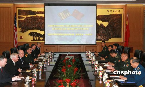 十一月五日,中華人民共和國中央軍委副主席、國務(wù)委員兼國防部長曹剛川在北京與美國國防部長羅伯特·蓋茨舉行會談。中新社發(fā) 廖文靜 攝
