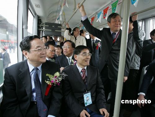 十一月六日,中共中央政治局委員、上海市委書記俞正聲(左)視察“2007中國(guó)國(guó)際工業(yè)博覽會(huì)”,并乘坐新能源公共汽車。據(jù)悉,這是俞正聲履新上海后,首次出席大型公眾活動(dòng)。中新社發(fā) 潘索菲 攝