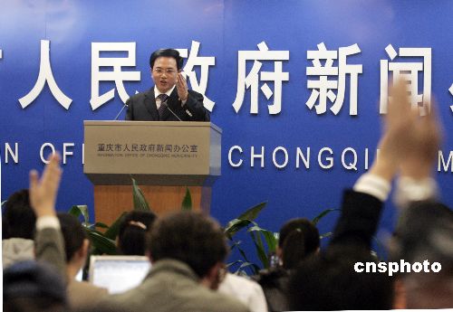 11月15日,重慶市人民政府舉行首場自主新聞發(fā)布會(huì),就三峽移民、交通改造和建設(shè)、醫(yī)療保險(xiǎn)、物價(jià)上漲、城鄉(xiāng)統(tǒng)籌試驗(yàn)區(qū)等當(dāng)?shù)厥忻窈蛧鴥?nèi)外媒體關(guān)注的問題進(jìn)行回答。重慶市是繼上海市后第二個(gè)舉行自主新聞發(fā)布會(huì)的中國城市。據(jù)悉,重慶自主新聞發(fā)布會(huì)目前暫定每月一次,定為每個(gè)月的第二個(gè)星期四下午舉行。中新社發(fā) 郭晉嘉 攝