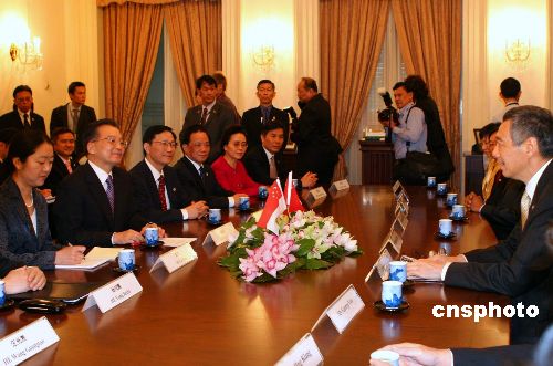 中國國務院總理溫家寶十一月十八日在此間與新加坡總理李顯龍舉行會談。雙方在友好、務實的氣氛中就進一步加強兩國互利合作達成多項重要共識。中新社發(fā) 周群 攝