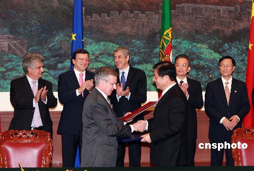 十一月二十八日,北京人民大會堂,中國國務(wù)院總理溫家寶會見歐盟輪值主席國葡萄牙總理索克拉特斯(后左三)與歐盟委員會主席巴羅佐(后左二),并在會見后共同出席中國與歐盟三項合作文本的簽字儀式。中新社發(fā) 廖文靜 攝