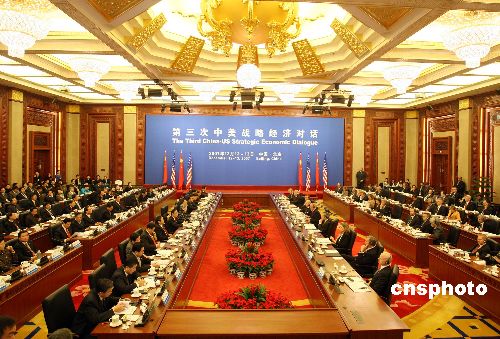 十二月十二日,第三次中美戰(zhàn)略經(jīng)濟(jì)對(duì)話在北京中信國(guó)安第一城開幕,胡錦濤主席特別代表、國(guó)務(wù)院副總理吳儀致辭。中新社發(fā) 毛建軍 攝