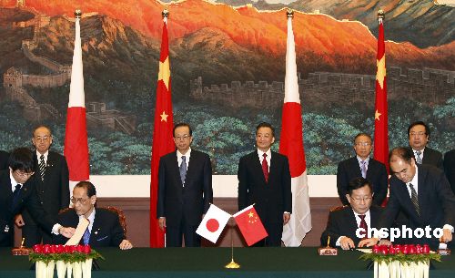 中日領(lǐng)導(dǎo)人出席雙方有關(guān)合作文件的簽字儀式