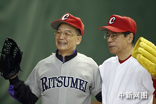 十二月二十九日,中國國務院總理溫家寶與日本首相福田康夫在北京釣魚臺國賓館內(nèi)的網(wǎng)球館共同練習棒球投球。作者:盛佳鵬
