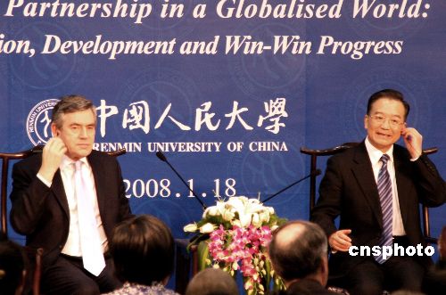 十八日下午,中國總理溫家寶與來華訪問的英國首相布朗一起來到中國人民大學(xué),與中英兩國的公眾代表進(jìn)行交流,共同回答兩國公眾關(guān)心的問題。中新社發(fā) 周兆軍 攝