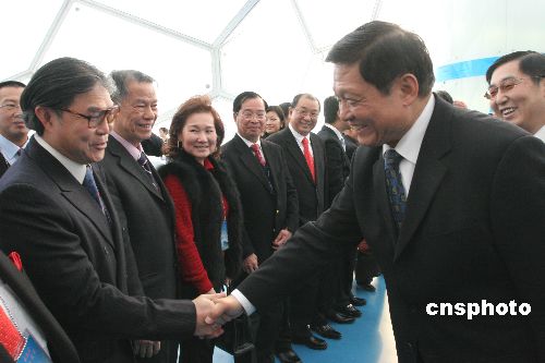 一月二十八日上午,在剛剛竣工的國家游泳中心內(nèi),北京市港澳臺僑同胞共建北京奧運(yùn)場館委員會(huì)舉行第八次向國家游泳中心(“水立方”)撥付捐款資金儀式。中共中央政治局委員、中共北京市委書記劉淇在儀式上與捐資人代表香港奧委會(huì)主席霍震霆握手。中新社發(fā) 王海波 攝
