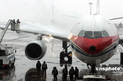圖:今春上海首班兩岸包機(jī)冒雪順利起飛