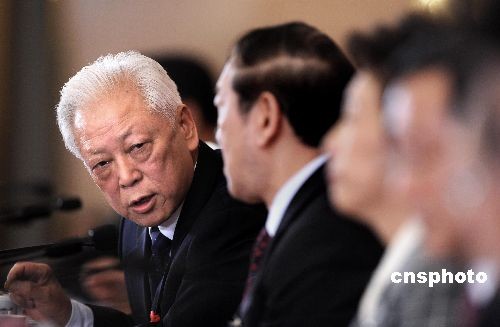 三月六日下午,全國政協(xié)十一屆一次會(huì)議記者招待會(huì)在北京人民大會(huì)堂新聞發(fā)布廳舉行,主題為“民主黨派中央主席談多黨合作”,中國八個(gè)民主黨派中央主席共同出席。圖為民革中央主席周鐵農(nóng)。中新社發(fā) 廖攀 攝