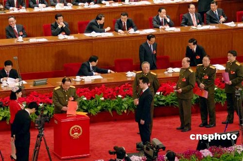 三月十五日上午,十一屆全國人大一次會(huì)議第五次全體會(huì)議在北京人民大會(huì)堂舉行,表決關(guān)于批準(zhǔn)國務(wù)院機(jī)構(gòu)改革方案的決定草案,選舉十一屆全國人大常委會(huì)委員長、副委員長,選舉國家主席、副主席及中央軍委主席等。中新社發(fā) 王東明 攝