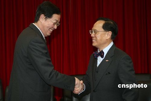 3月18日,香港特別行政區(qū)行政長官曾蔭權(quán)在北京先后拜訪了中國人民銀行和中國證券監(jiān)督管理委員會。圖為曾蔭權(quán)與中國人民銀行行長周小川握手。中新社發(fā) 盛佳鵬 攝