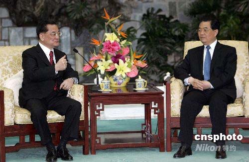 4月29日下午,中共中央總書記胡錦濤,在北京釣魚臺會見中國國民黨榮譽主席連戰(zhàn)。中新社發(fā) 任晨鳴 攝