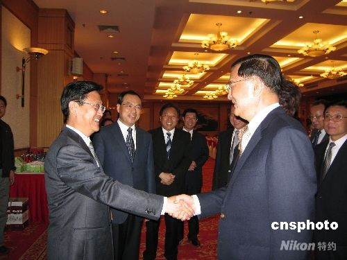 五月四日晚,中共武漢市委書記楊松宴請中國國民黨榮譽主席連戰(zhàn)一行。圖為楊松(左一)與武漢市市長阮成發(fā)(左二)歡迎連戰(zhàn)一行。中新社發(fā) 艾啟平 攝