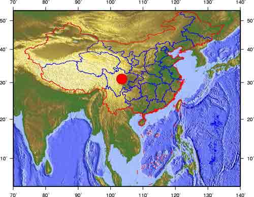 中新網(wǎng)5月12日電 據(jù)中國地震臺網(wǎng)測定,2008年5月12日14時28分04秒,四川汶川縣(北緯31.0,東經(jīng)103.4)發(fā)生7.8級地震。以上是中國地震信息網(wǎng)發(fā)布的地震震中示意圖。