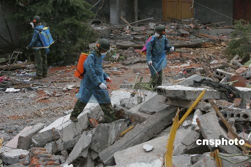 圖:防疫隊對地震的重災(zāi)區(qū)紅白鎮(zhèn)進行防疫工作