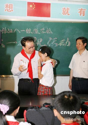 中共中央政治局常委李長(zhǎng)春,6月1日赴四川災(zāi)區(qū)看望慰問(wèn)災(zāi)區(qū)兒童,向?yàn)?zāi)區(qū)轉(zhuǎn)移安置和受傷治療的學(xué)生轉(zhuǎn)交中央宣傳文化部門贈(zèng)送的十萬(wàn)臺(tái)收音機(jī)和一批少兒讀物及學(xué)習(xí)用品。中新社發(fā) 蒲滔 攝