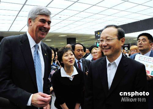 當(dāng)?shù)貢r間6月17日晚,中國公民赴美旅游首發(fā)團(tuán)抵達(dá)華盛頓杜勒斯國際機(jī)場,中國國家旅游局局長邵琪偉在隨北京團(tuán)抵達(dá)后對記者表示,中美兩國在旅游方面有了很好的旅游機(jī)制,首發(fā)團(tuán)到達(dá)美國,標(biāo)志著中美兩國團(tuán)隊旅游開始全面啟動。這將對今后中美之間政治、經(jīng)濟(jì)、文化等方面的合作起到積極的推動作用。圖為邵琪偉受到美國商務(wù)部助理部長威廉姆斯·薩頓等熱烈歡迎。中新社發(fā) 邱江波 攝