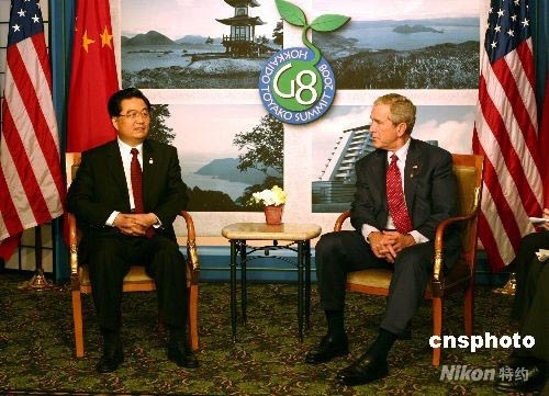 正在日本北海道出席八國集團同發(fā)展中國家領導人對話會的中國國家主席胡錦濤,當?shù)貢r間7月9日下午會見美國總統(tǒng)布什,雙方就中美關系和其他共同關心的問題深入交換了意見。布什還表示,希望得到美國和中國的奧運會籃球比賽的門票。他笑著對胡錦濤說:“如果您能幫我搞到票的話,我將非常感激。” 中新社發(fā) 張朔 攝
