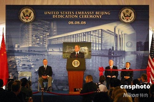 八月八日,美國駐華大使館舉行了隆重的新館開館儀式,前來出席北京奧運會開幕式的美國總統(tǒng)布什、前總統(tǒng)老布什,以及中國國務委員戴秉國出席儀式并致辭。中新社發(fā) 阮煜琳 攝