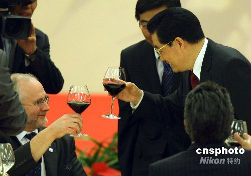 圖為胡錦濤在歡迎宴會(huì)上向國(guó)際殘奧委會(huì)主席克雷文祝酒致意。