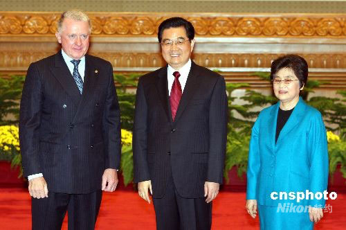 9月6日,國(guó)家主席胡錦濤夫婦在北京人民大會(huì)堂歡迎出席2008年殘奧會(huì)的各國(guó)貴賓。圖為胡錦濤夫婦歡迎第29屆奧運(yùn)會(huì)協(xié)調(diào)委員會(huì)主席維爾布魯根。中新社發(fā) 任海霞 攝