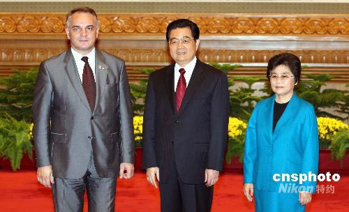 9月6日,中國(guó)國(guó)家主席胡錦濤夫婦在北京人民大會(huì)堂歡迎出席2008年殘奧會(huì)的各國(guó)貴賓。圖為胡錦濤夫婦歡迎波蘭副總理帕夫拉克。中新社發(fā) 任海霞 攝