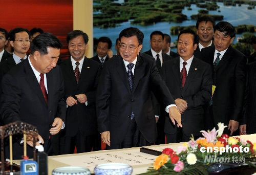 9月22日,中共中央政治局常委、中央紀(jì)委書(shū)記賀國(guó)強(qiáng),在卷頭為“寧夏回族自治區(qū)成立50周年成就展”簽名后,提議中央代表團(tuán)其他成員也為該展簽名。當(dāng)日下午,以賀國(guó)強(qiáng)為團(tuán)長(zhǎng)的中央代表團(tuán)在銀川參觀(guān)“寧夏回族自治區(qū)成立50周年成就展”。中新社發(fā) 廖攀 攝