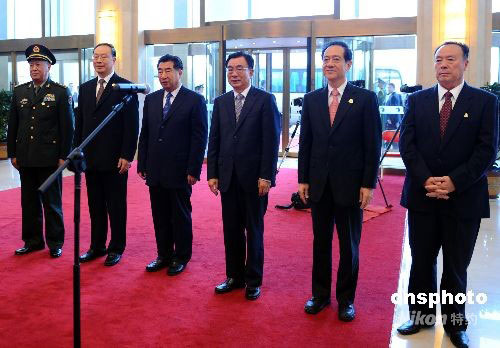 9月23日,中央代表團(tuán)團(tuán)長賀國強(qiáng)(右三)、副團(tuán)長回良玉(左三)、韓啟德(右二)、杜青林(左二)、白立忱(右一)、陳炳德(左一)出席寧夏回族自治區(qū)成立50周年相關(guān)活動(dòng)。中新社發(fā) 廖攀 攝