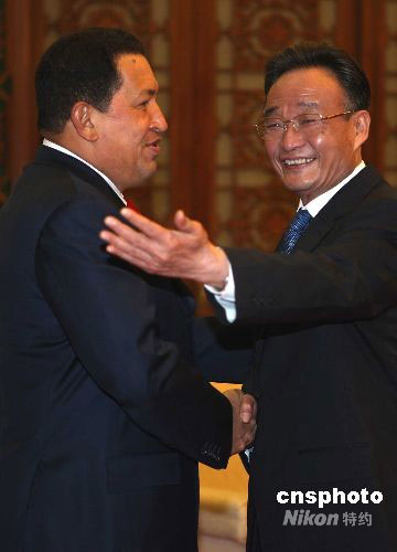 9月24日下午,中國全國人大常委會委員長吳邦國在北京人民大會堂會見來訪的委內瑞拉總統查韋斯。中新社發(fā) 任晨鳴 攝