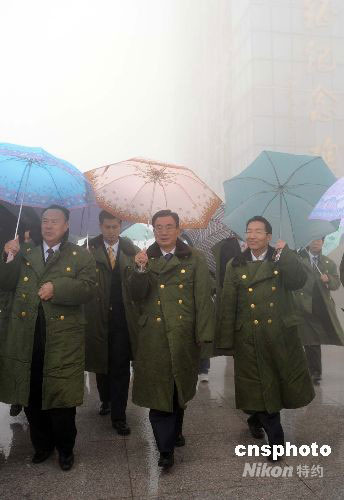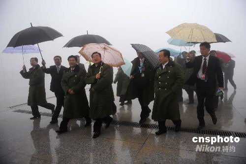 9月25日,寧夏六盤山寒雨紛飛,賀國(guó)強(qiáng)率團(tuán)冒雨參觀位于六盤山主峰上的六盤山紅軍長(zhǎng)征紀(jì)念館。當(dāng)日,賀國(guó)強(qiáng)率中央代表團(tuán)一分團(tuán)繼續(xù)在寧夏固原市展開慰問。中新社發(fā) 廖攀 攝