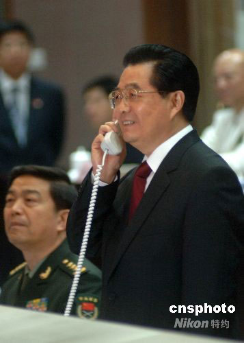 九月二十七日下午,神舟七號(hào)載人飛船翟志剛等三名航天員成功完成中國(guó)首次太空出艙活動(dòng)后,親臨北京航天飛行控制中心觀看中國(guó)人這一歷史性壯舉的中共中央總書(shū)記、國(guó)家主席、中央軍委主席胡錦濤,與航天員們進(jìn)行了天地通話。中新社發(fā) 張桐勝 攝