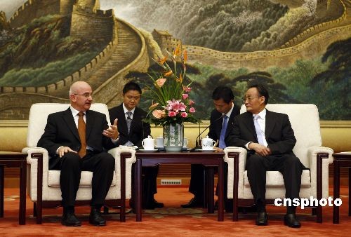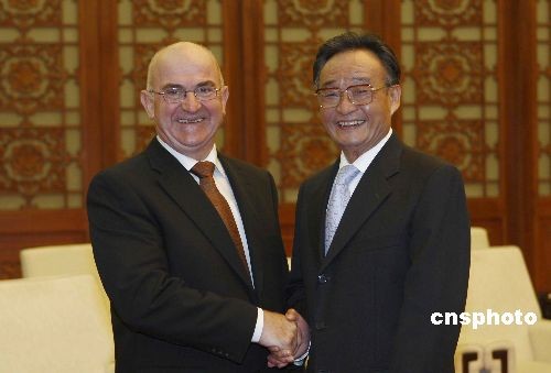 10月15日,中國(guó)全國(guó)人大常委會(huì)委員長(zhǎng)吳邦國(guó)在北京人民大會(huì)堂會(huì)見瑞士聯(lián)邦議會(huì)國(guó)民院議長(zhǎng)布永。中新社發(fā) 盛佳鵬 攝