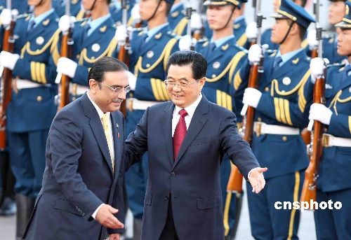 10月15日下午,中國國家主席胡錦濤在北京人民大會(huì)堂東門外廣場舉行儀式,歡迎巴基斯坦總統(tǒng)扎爾達(dá)里訪華。扎爾達(dá)里總統(tǒng)是應(yīng)胡錦濤的邀請從10月14日至17日對中國進(jìn)行國事訪問,這是扎爾達(dá)里就任總統(tǒng)后的首次正式出訪。中新社發(fā) 任晨鳴 攝