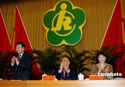 國(guó)務(wù)院副總理回良玉祝賀鄧樸方(中)當(dāng)選為中國(guó)殘聯(lián)名譽(yù)主席,張海迪(右)當(dāng)選為中國(guó)殘聯(lián)主席。