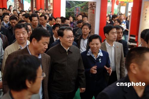 十一月十六日至二十日,中共中央政治局常委李長春在福建視察工作。十七日,李長春在中共福建省委書記盧展工、福建省省長黃小晶、中共南平市委書記雷春美(女)等陪同下,視察正在武夷山市舉行的第二屆海峽兩岸茶業(yè)博覽會展覽。中新社發(fā) 鄭祚聲 攝