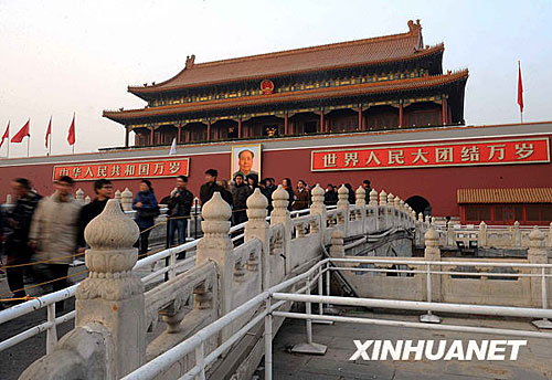 據北京市文物局9日透露,為迎接2009年國慶60周年,確保游客和文物安全,北京市文物局已于近日啟動了天安門金水橋加固修繕工程,整個工程預計將于2009年5月完工。天安門金水橋是整個天安門景觀的重要組成部分,因游客眾多以及風化等自然因素,天安門金水橋橋面此前多處出現破損,欄桿部分也出現裂縫,存在一定的安全隱患。新華社記者羅曉光攝