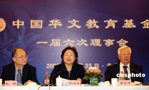十二月二十三日,國(guó)僑辦主任李海峰(中)、全國(guó)政協(xié)原副主席羅豪才(右)、國(guó)僑辦副主任趙陽(yáng)出席中國(guó)華文教育基金會(huì)理事會(huì)。當(dāng)日,中國(guó)華文教育基金會(huì)一屆六次理事會(huì)在北京召開(kāi),會(huì)議選舉第十一屆全國(guó)政協(xié)委員、中國(guó)海外交流協(xié)會(huì)副會(huì)長(zhǎng)林文肯任中國(guó)華文教育基金會(huì)理事長(zhǎng)。張偉超由于年齡原因,不再擔(dān)任理事長(zhǎng)。中新社發(fā) 廖攀 攝
